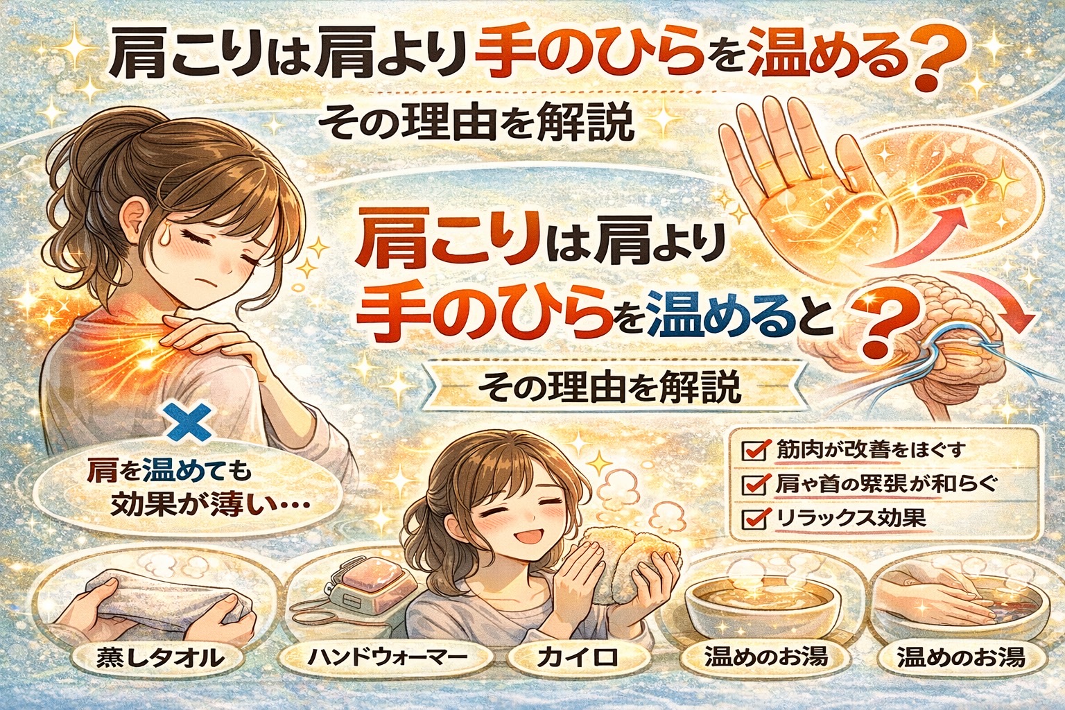 手を温めることで血流が促され、その影響が腕や肩周辺にも広がる可能性があるのです。